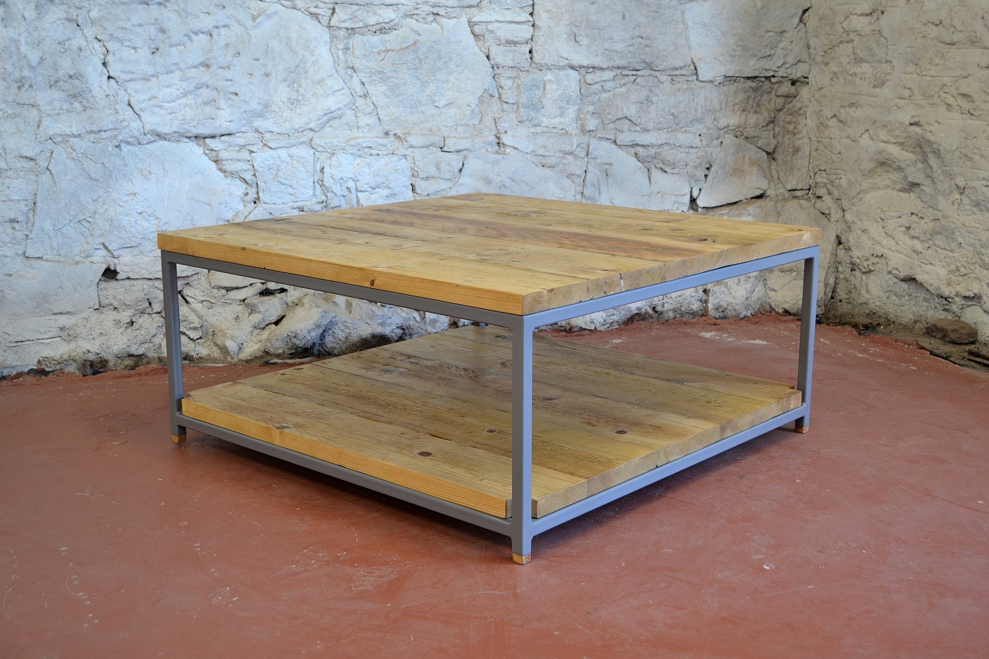 This industrial-style coffee table is handcrafted using a square-profile steel frame and solid reclaimed wood for both the tabletop and lower shelf. Practical and stylish, it’s perfect for homes, cafes, bars, or restaurant interiors that embrace character and functionality.
